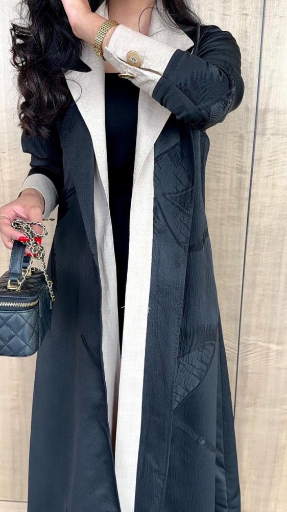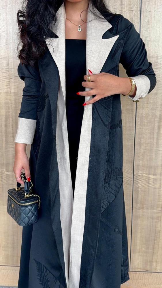 مصنوعة من قماش جاكار كريب فاخر بتفاصيل بارزة أنيقة، مع لمسات لِنن بيج على الياقة والأكمام تضيف تباين عصري مميز.