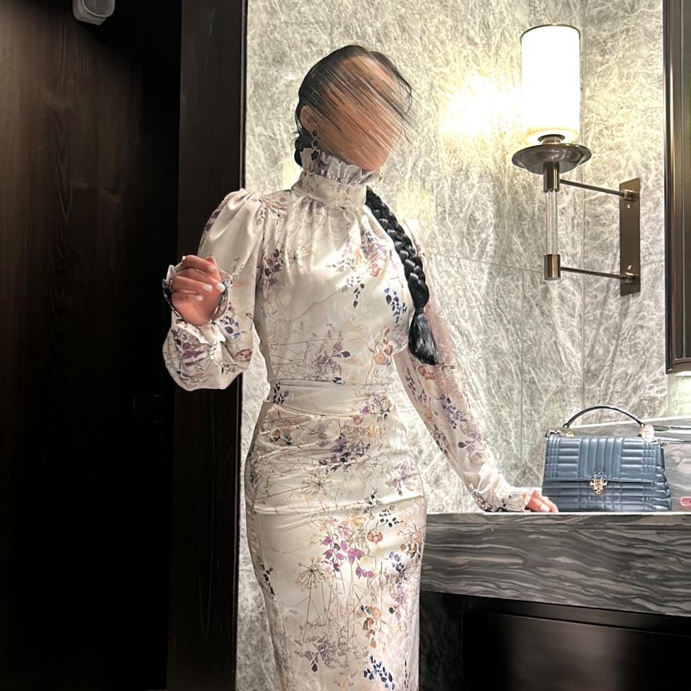 A short dress made of luxurious Turkish satin bubblegum, with an elegant design and soft prints, puffed sleeves and elegant ruffles around the neck.